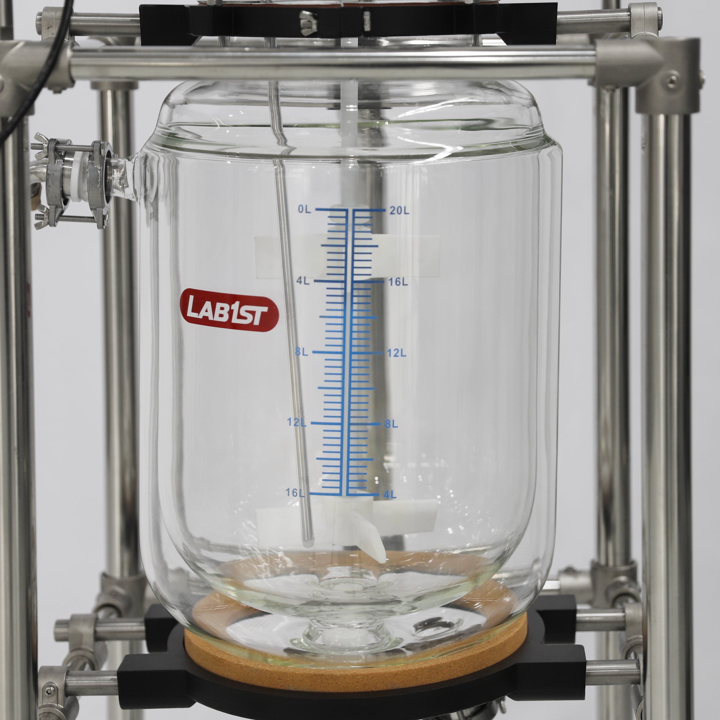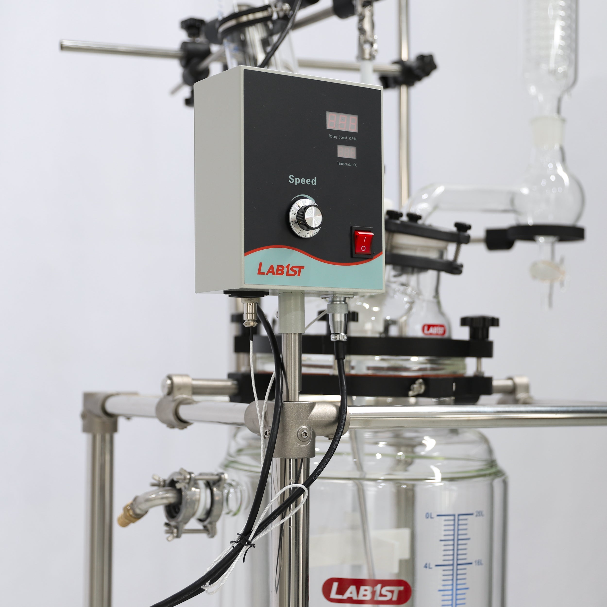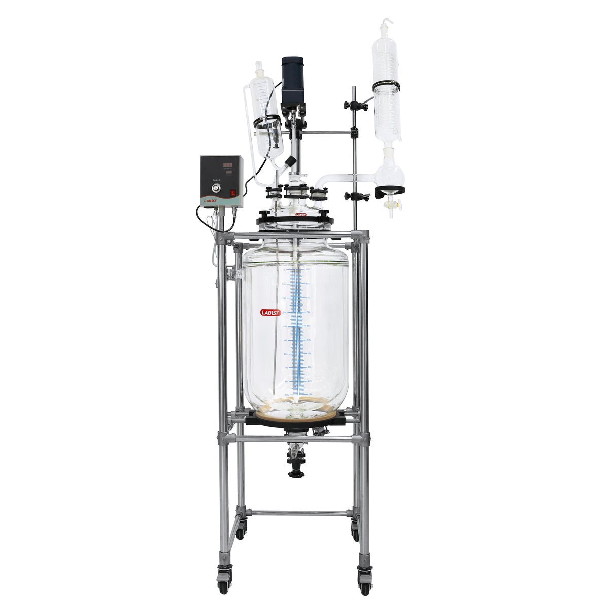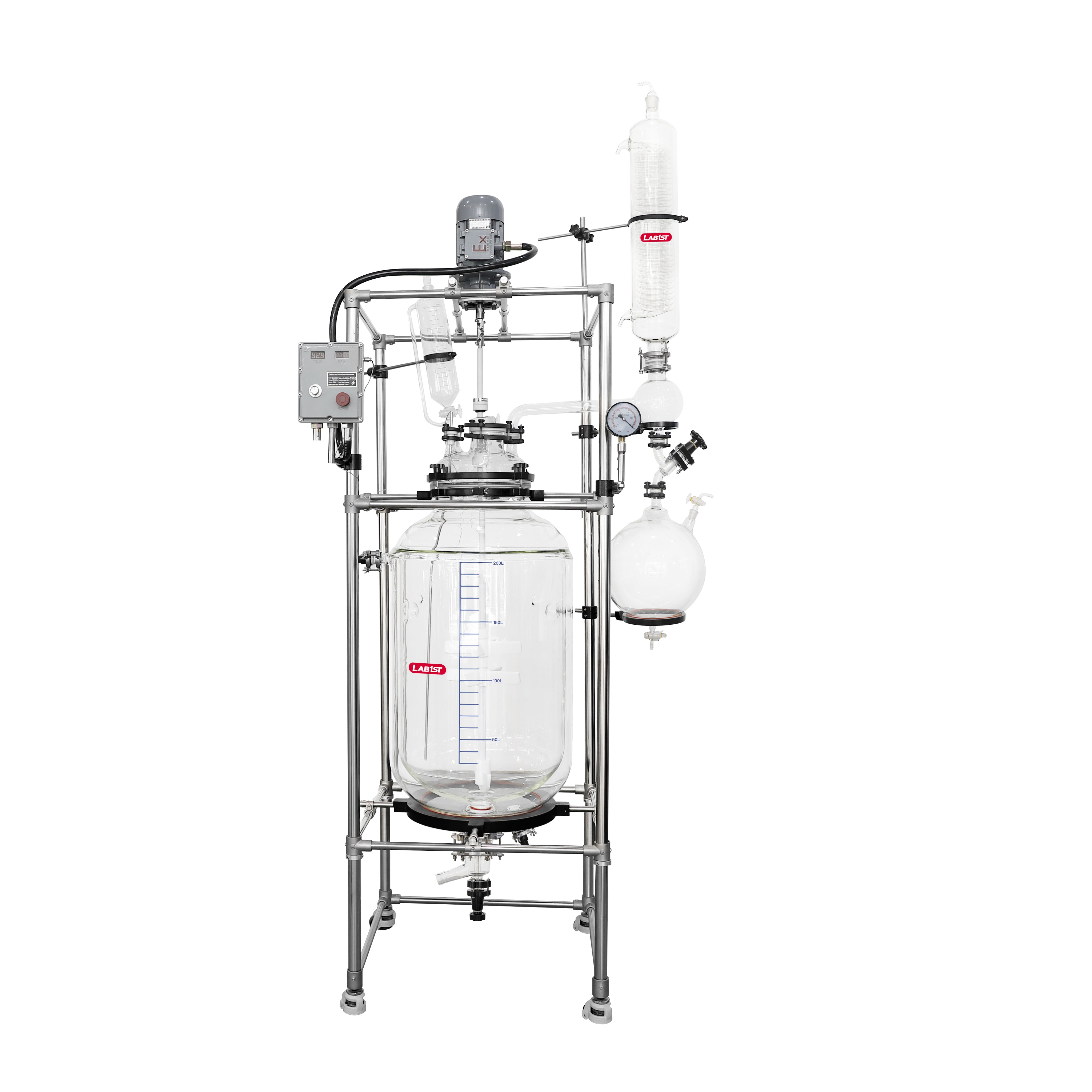 Lab1st JGR-L series jacketed glass reactors are designed as a multi-purpose reaction platform with controlled temperature and pressure environment, for both laboratory and scale-up applications. Each reactor consists of a corrosion resistant jacketed glass reaction vessel, PTFE coated variable speed stirrer system, temperature probe and digital display, and other accessories like feeding funnel, coiled condenser and bottom discharge valve.